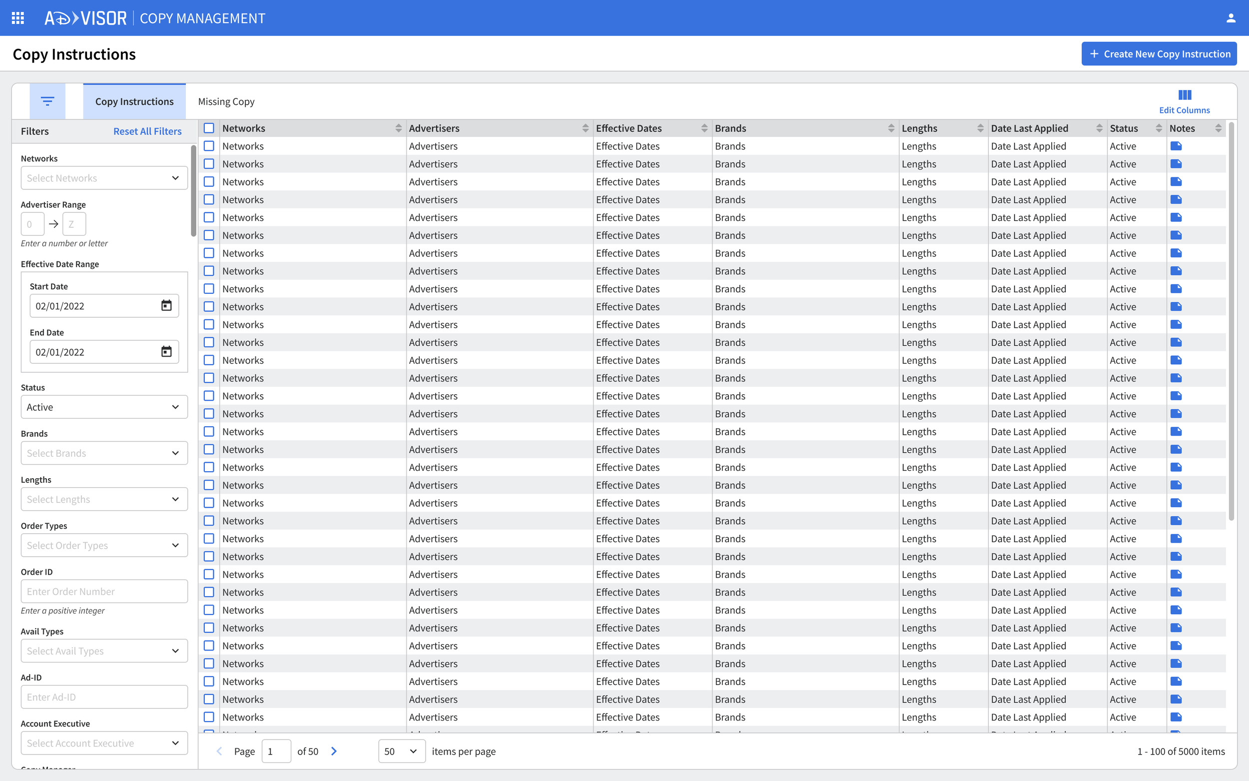 I started with low fidelity wireframes to show the screen flow from a Copy Instruction table to creating or editing a Copy Instruction. I took inspiration from other AdVisor products because editing was a common experience throughout the platform.