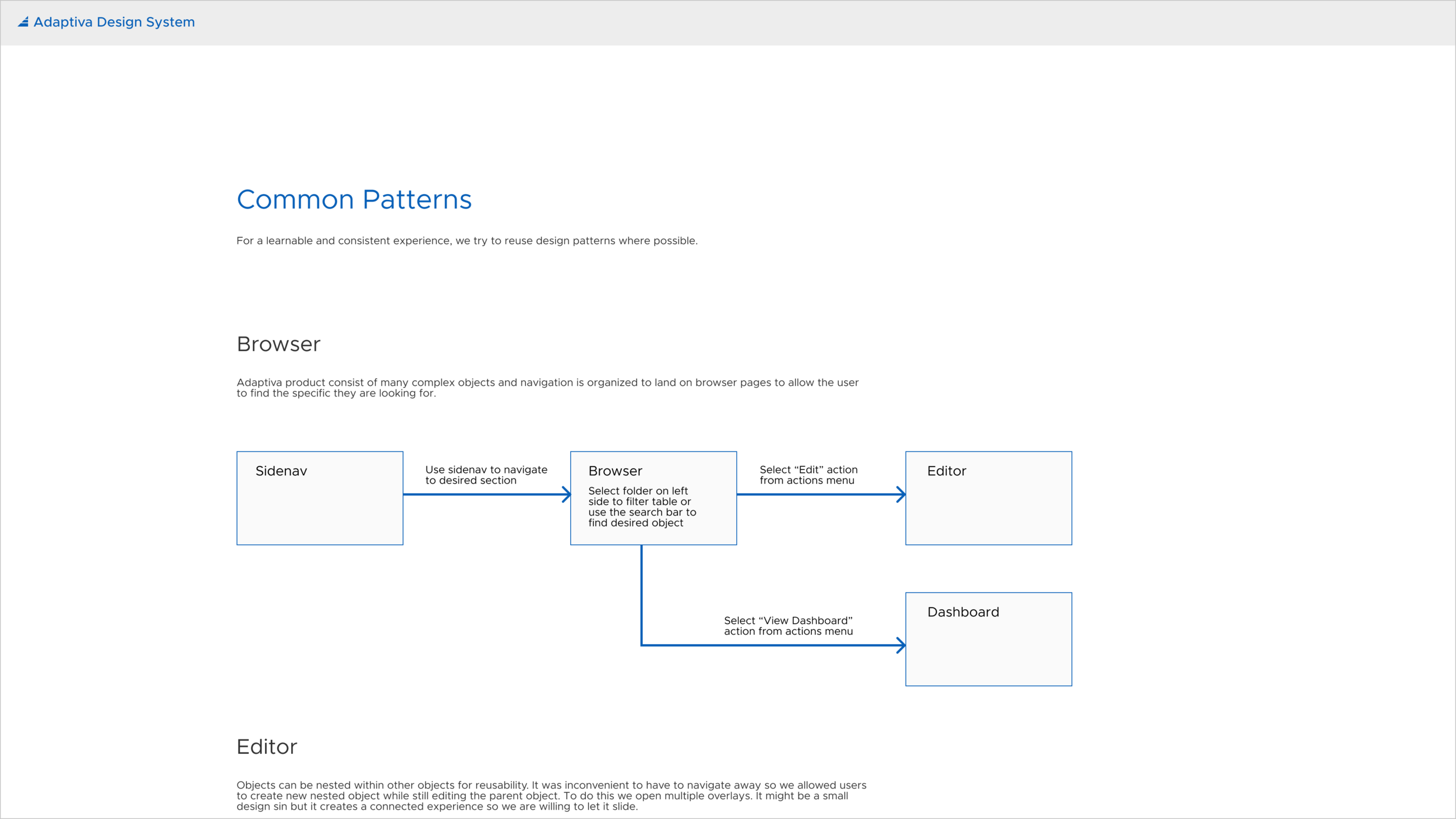 In addition to defining components, I identified common experience patterns throughout Adaptiva's products. As I took on more projects with different screen flows, I continued to add to this list. These experiences include flows for browsers, editors, dashboards, and settings. I often reference common patterns when brainstorming new features to products with stakeholders and plan to continue iterating to improve the experience flows.